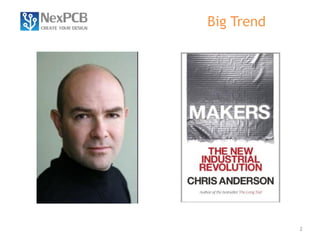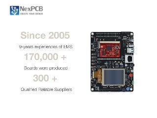 The document discusses NexPCB and how they help hardware makers with product development and manufacturing. It outlines NexPCB's services like PCB fabrication, assembly, sourcing components, and supply chain management to help makers focus on design while NexPCB handles production. The document also mentions NexPCB has facilities in China, Boston, and Hong Kong to serve a global customer base.