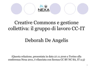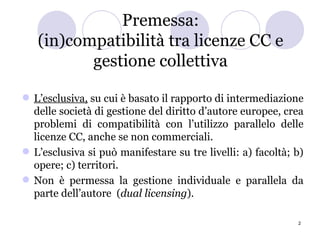 Il documento esplora la relazione tra le licenze Creative Commons (CC) e la gestione collettiva dei diritti d'autore, evidenziando le problematiche di compatibilità tra le due. Si sottolinea la necessità di flessibilità per gli autori, consentendo loro di gestire le opere sotto licenze libere mentre utilizzano la SIAE per la raccolta di proventi. Viene proposta una revisione del mandato SIAE per facilitare l'inclusione di opere con licenze CC, affrontando anche la distinzione tra usi commerciali e non commerciali.