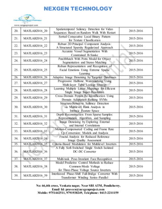 Nexgen Technology offers a range of MATLAB projects for the years 2015-2016, focusing on advanced topics such as machine learning, image processing, and power systems. The projects include innovative solutions for face recognition, video tracking, image segmentation, and saliency detection among others. Contact details for Nexgen Technology are provided, including email and phone numbers for inquiries.