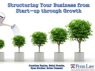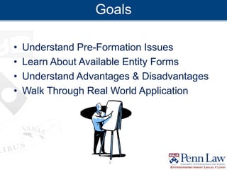 The document outlines critical considerations for business formation, including pre-formation issues, available entity types such as sole proprietorships, partnerships, and corporations, and their respective advantages and disadvantages. It discusses the implications of business size, ownership structure, liability, taxation, and administrative requirements. Additionally, real-world case studies are presented to illustrate the decision-making process in choosing the appropriate business entity.