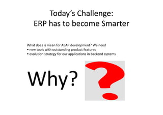 Next-generation apps need new tools like BRFplus/DSM to automate decision making using flexible, configurable business rules. BRFplus/DSM allows rules to be changed and deployed without downtime, supports predictive features, and can push logic to HANA. It is important for ABAP developers as many SAP solutions now use BRFplus/DSM, and it offers rapid development of intelligent, understandable business logic. Separating rules from processes and not implementing rules through customizing ensures rules can adapt over time.