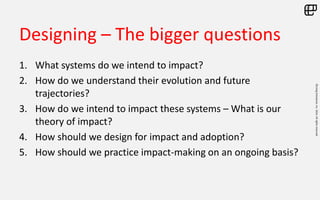 The document explores the evolving nature of design and its implications for enterprises in addressing complex contemporary challenges. It highlights the transition from traditional design paradigms to a focus on purpose, co-creation, and service ecosystems, emphasizing the need for a new mindset among designers. Through various lenses, including business complexity and ecological thinking, it advocates for inclusive and adaptive design practices that foster meaningful impact and value creation.