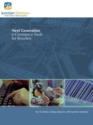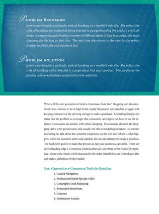 Next generation e-commerce tools can help reduce shopping cart abandonment rates and improve the customer experience. These tools include guided navigation to help customers easily find products, product-specific URLs for improved searchability, geographic load balancing to ensure site speed, rebranded storefronts like microsites tailored to audiences, dynamic coupons generated during searches, and search-relevant articles. Using these tools can engage customers longer and increase the chances of a sale through a simpler, more personalized experience.