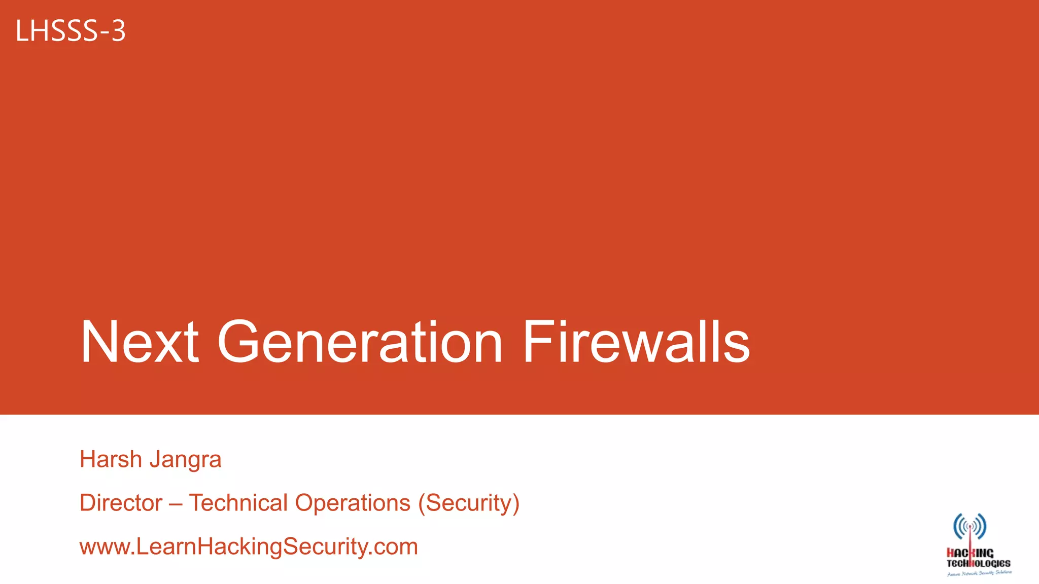 Next generation firewalls aim to provide integrated threat protection through consolidation of gateway functions in virtual appliances with enterprise-class features for all segments. They aim to keep up with evolving intelligence-based threats by providing end-to-end policy compliance across all devices, including mobile, and virtualization capabilities for multi-tenant environments. Firewalls have evolved over 25 years from basic packet filtering to deep packet inspection to address more sophisticated threats that can bypass policies by posing as legitimate traffic.