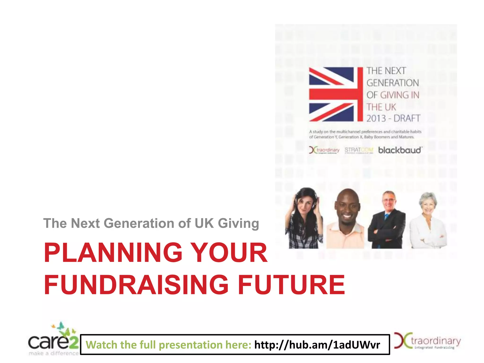 The document discusses the evolution of fundraising in the UK, highlighting the importance of multi-channel giving and the engagement of different donor demographics, particularly Gen X and Gen Y. It emphasizes the need for integrated communication strategies and personalized donor experiences to enhance fundraising effectiveness. A case study illustrates how one charity successfully increased its income through multi-channel integration, demonstrating the value of diverse giving methods and consistent messaging.
