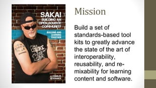 The document outlines the vision for next generation teaching and learning (NGTL), emphasizing the development of standards-based toolkits to enhance interoperability, reusability, and remixability of learning content. It details the creation of API libraries, app stores, content stores, and various learning management systems aligned with IMS standards. Additionally, it discusses key tenets of the NGTL movement, including the shift to smaller, scalable LMS, abundant content repositories, and the utilization of app stores for feature-rich functionalities.