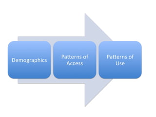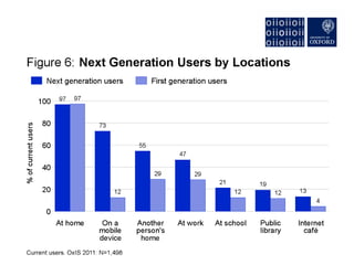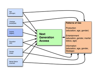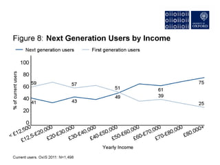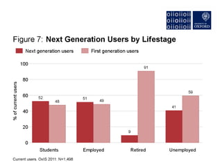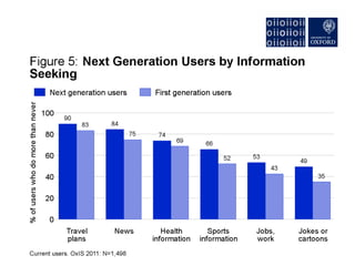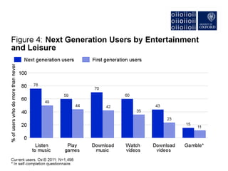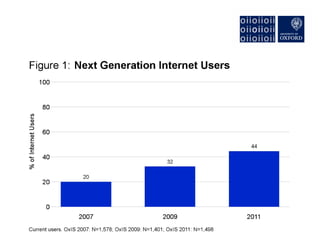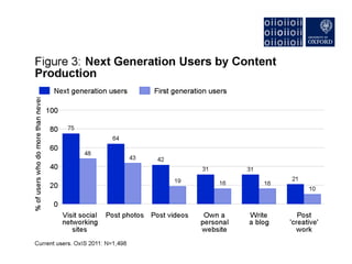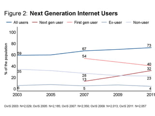 The document discusses the rise of "Next Generation Users" of the internet, who are shaping new patterns of use. It finds that these Next Generation Users are more engaged in civic participation and using digital government services compared to First Generation and non-users. The document concludes by emphasizing the importance of understanding these Next Generation Users to inform user-oriented design and policy approaches that address new digital divides in internet access and use.