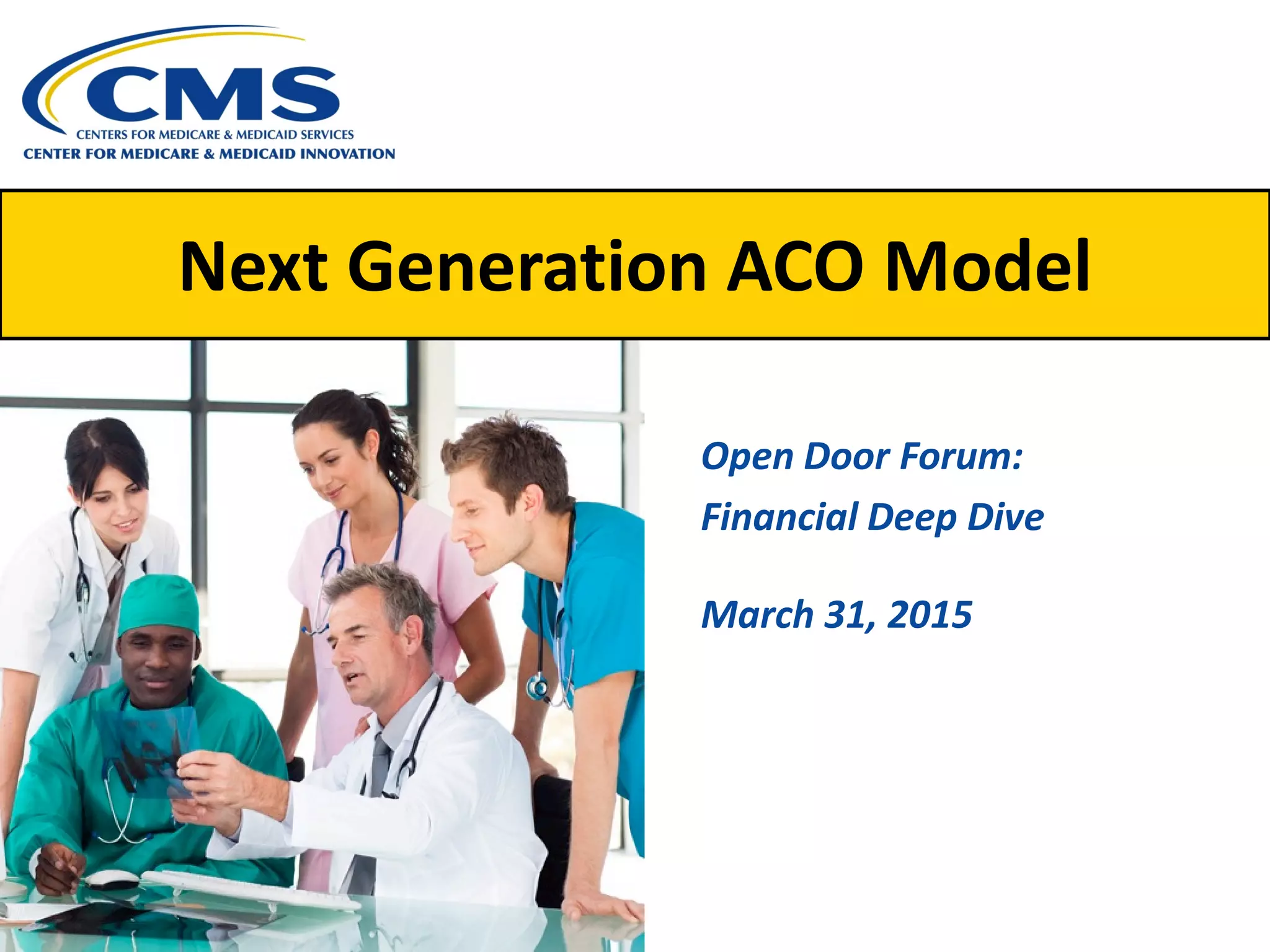 The document outlines the Next Generation Accountable Care Organization (ACO) Model's financial framework established during a forum on March 31, 2015. It details the components of the financial model, including benchmarks for ACOs, risk arrangements, payment mechanisms, and discount calculations for performance years 2016-2018. Key milestones and timelines for ACO applications and financial methodologies are also provided, aiming to incentivize quality and efficiency in healthcare practices.