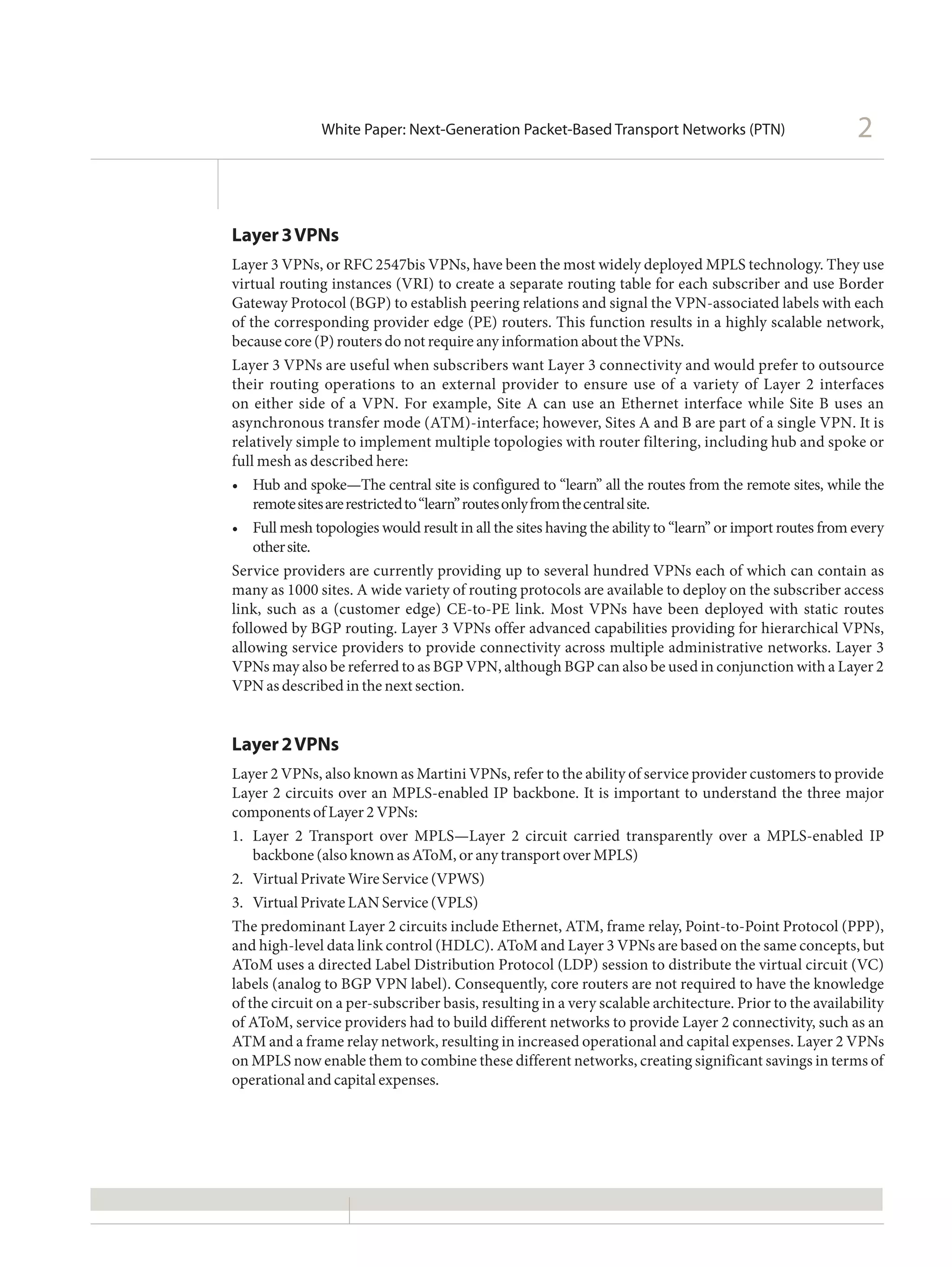 This white paper discusses next-generation packet-based transport networks (PTN) with a focus on MPLS technologies. It describes how MPLS allows for cost-efficient routing of traffic in core networks and how it is used to deliver layer 3 and layer 2 VPN services. The paper also discusses layer 3 VPNs, layer 2 VPNs, virtual private wire service (VPWS), and virtual private LAN service (VPLS) as the major components of layer 2 VPNs delivered over MPLS networks.
