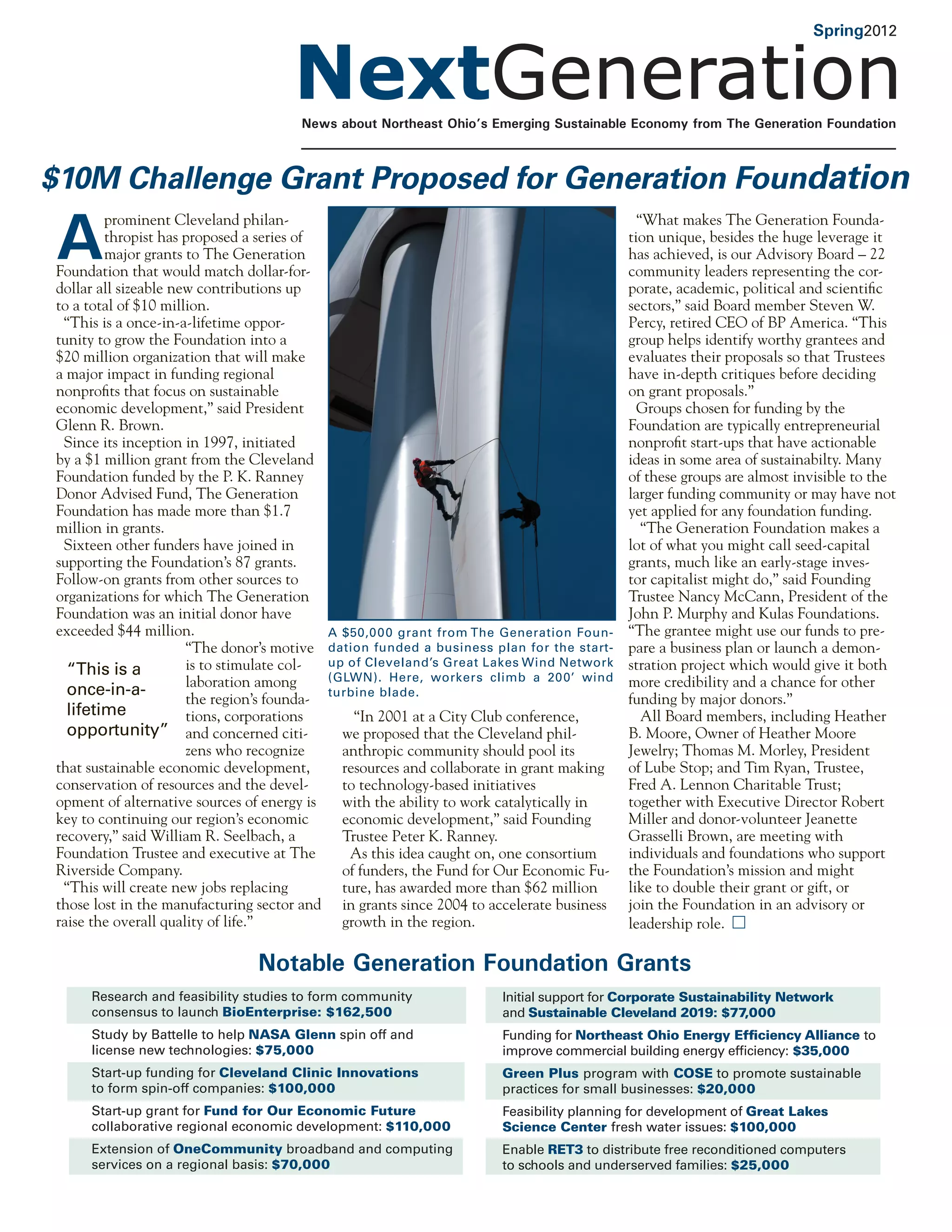 A prominent Cleveland philanthropist has proposed a $10 million matching grant challenge to The Generation Foundation that would double the Foundation's size to $20 million. This would allow the Foundation to significantly increase its funding of regional nonprofits focused on sustainable economic development. Since starting in 1997 with a $1 million grant, the Foundation has awarded over $1.7 million in grants and leveraged over $44 million in additional funding for grantee organizations. A new advisory board member says the Foundation identifies worthy nonprofits working in sustainability that may be overlooked by other funders.