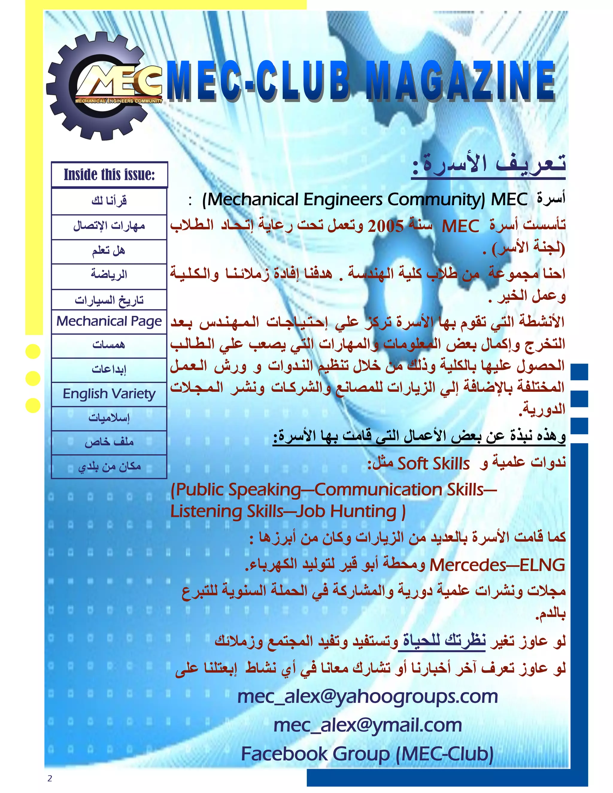 المهندسون الميكانيكيون في المجتمع يعقدون اجتماعات دورية لتبادل المعرفة والخبرات وترقية المهارات المهنية. تتضمن الإصدارة الأخيرة فعاليات ومواضيع تركز على تطوير المهارات العامة مثل التواصل والبحث عن عمل، بالإضافة إلى أهمية العمل الجماعي. كما تم ذكر جهات محلية ودولية تقدم الدعم المهني والتدريبي لأعضاء المجتمع.