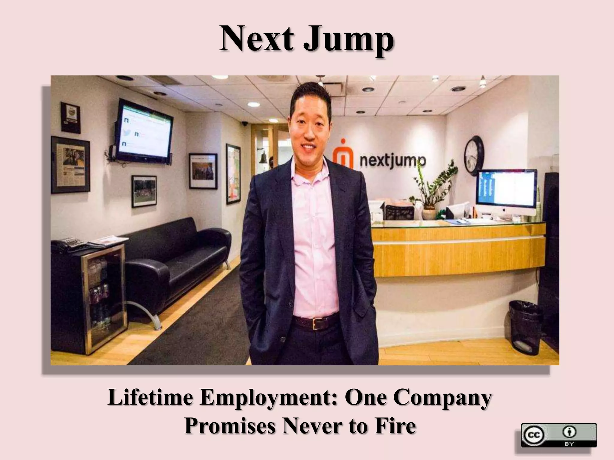 Next Jump is an e-commerce company founded in 1994 that offers lifetime employment and promises never to fire employees. The company focuses heavily on developing its employees through a four level training program that includes physical, emotional, mental, and leadership development. Employees spend 50% of their time on growth and development activities like workshops, feedback programs, and skill-building initiatives. The goal is for employees to continuously improve themselves so they can better help others, creating a better company culture.