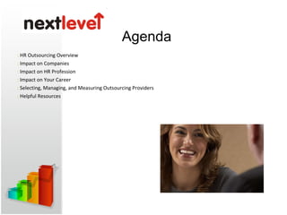 The document discusses human resource (HR) outsourcing, including why and who should consider outsourcing HR functions. It notes that 58% of companies outsource some HR functions and that spending on HR outsourcing will double in the next 5 years. Key benefits of HR outsourcing include allowing HR to focus on strategic work, improving quality and efficiency, and reducing costs. The document also covers trends in the HR outsourcing market and the impacts of outsourcing on companies and HR professionals.