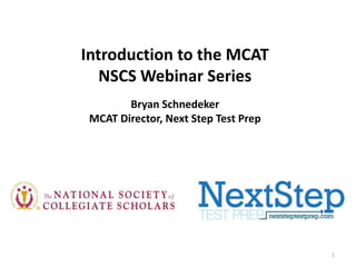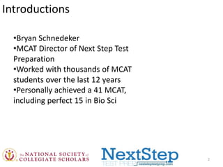 This document presents an overview of the MCAT, detailing its importance in medical school admissions, the test structure, scoring, and preparation strategies. It emphasizes the significance of early preparation, the necessity of taking full practice tests, and recommends utilizing official AAMC materials. Additionally, it outlines various study options, tutoring services from Next Step Test Prep, and key strategies for success on the exam.