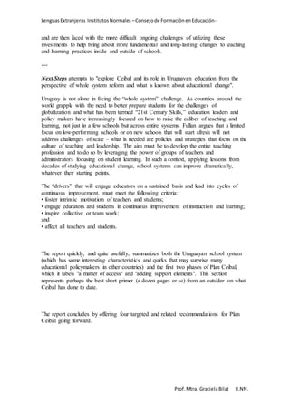 The document discusses next steps for Uruguay's Plan Ceibal initiative, which provided free laptops to all public school students. It summarizes the initiative's achievements in introducing ICTs across the entire education system. It also discusses potential challenges for sustaining investments to fundamentally change teaching and learning. The report analyzes Plan Ceibal from the perspective of whole system reform and educational change. It recommends that Plan Ceibal focus on developing teacher professionalism, leadership, and continuous improvement to drive sustained, system-wide improvements in teaching and learning.