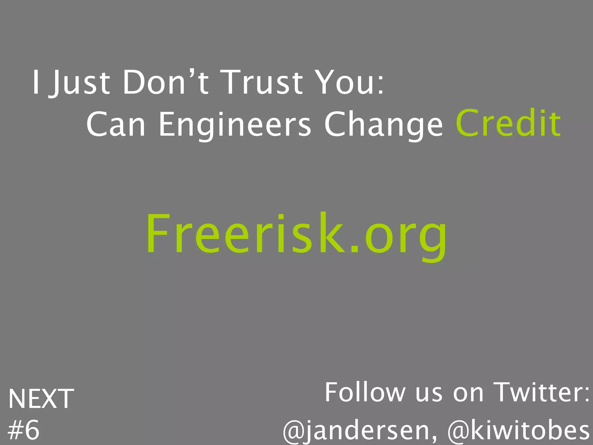 This document discusses the need for open and transparent credit rating systems as an alternative to the existing "Big Three" credit rating agencies (Moody's, S&P, Fitch). It proposes Freerisk, a commons approach to credit risk that utilizes open financial data sources and user-contributed rating algorithms. The document outlines some issues with the current opaque and conflicted system and argues that Freerisk could help create a more accurate and diverse assessment of risk through greater transparency, data sharing, and algorithmic contributions.
