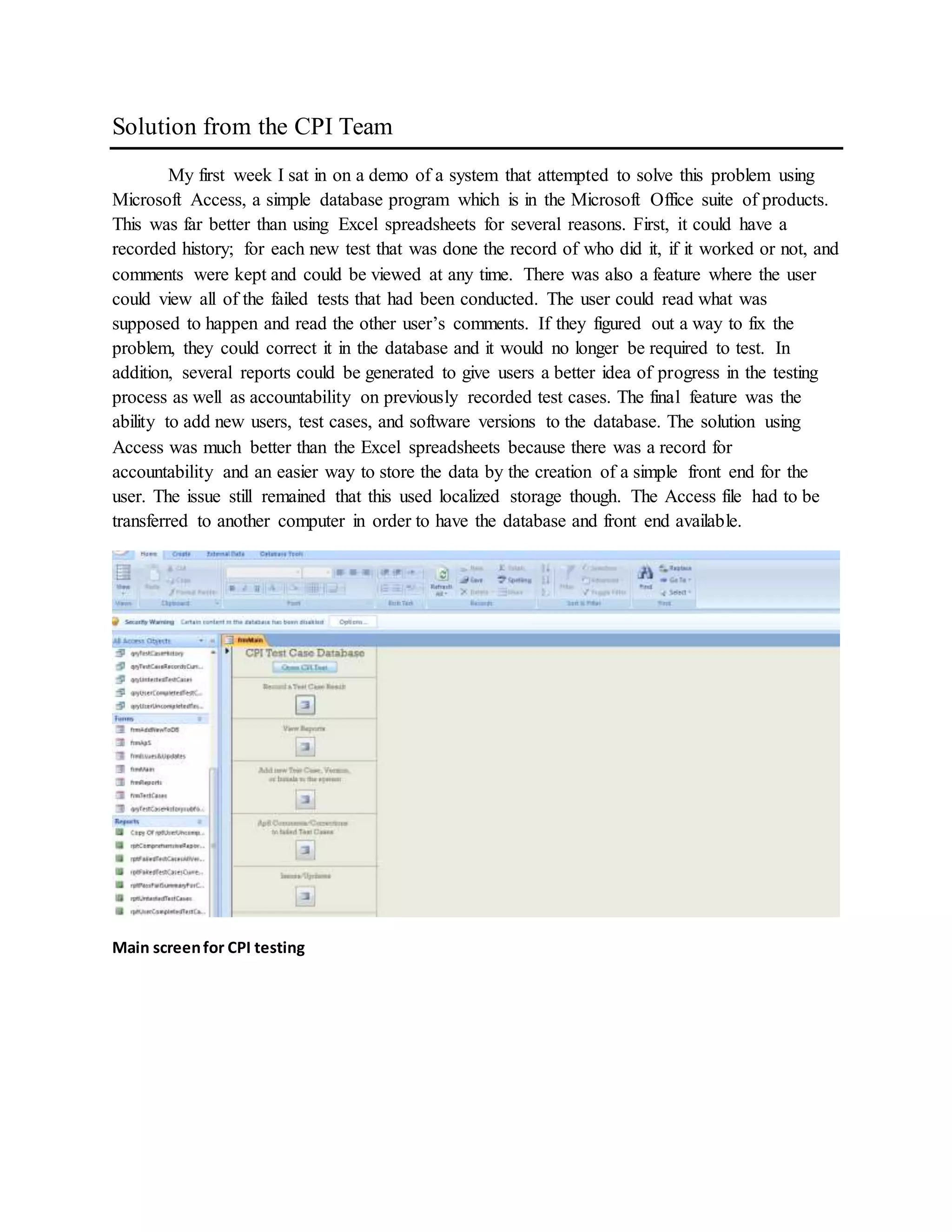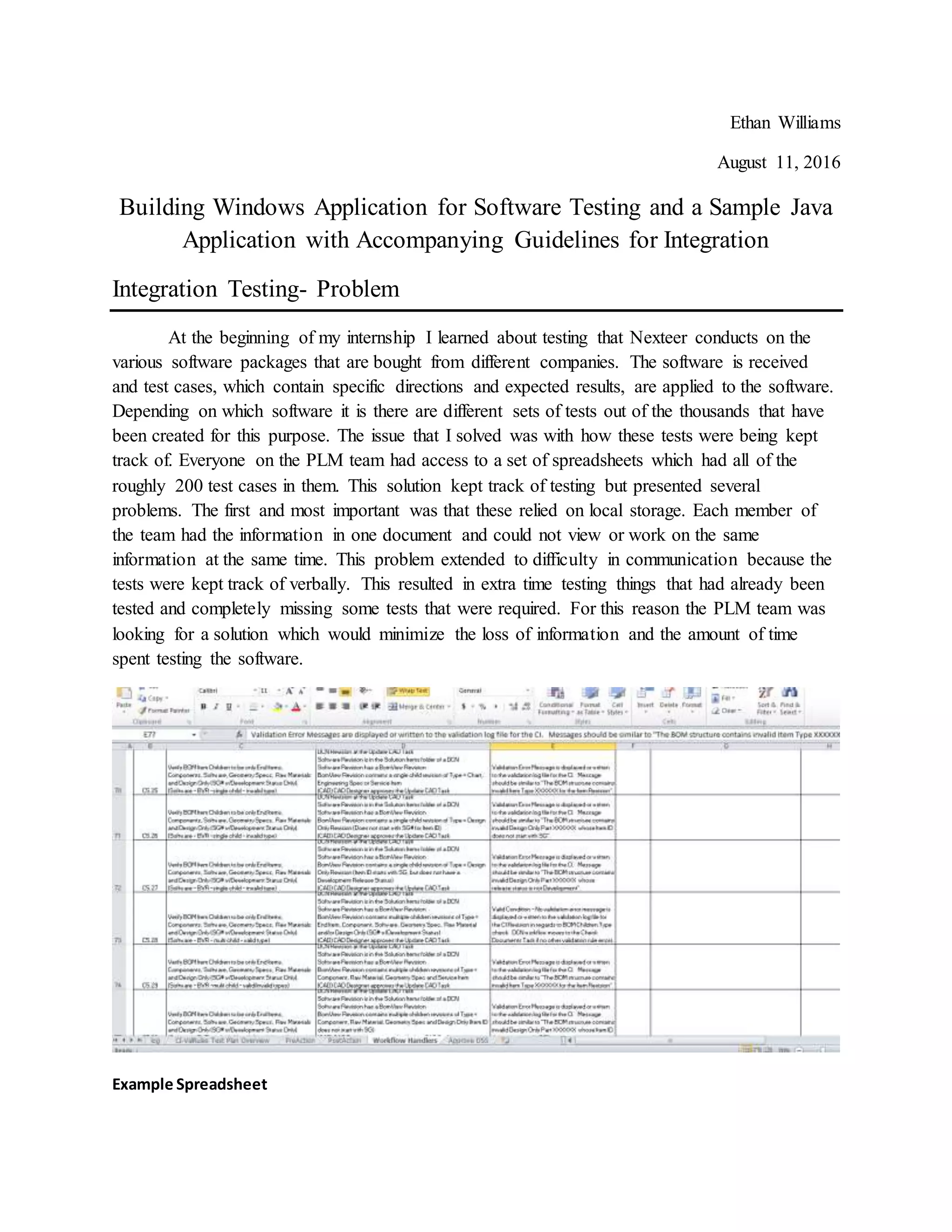 This document summarizes Ethan Williams' solution to integrate software testing at Nexteer. He created a Windows application connected to a SQL database to track over 2,000 test cases more efficiently than spreadsheets. The initial version allowed recording test results and generating reports. Based on feedback, he improved the final version in C# using filters to select relevant test cases and batch recording of results to streamline the process. The new system provided accountability, easy data storage and minimized redundant testing.