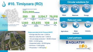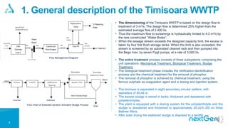 The document discusses plans to implement next generation solutions at the Timisoara WWTP in Romania. The WWTP currently treats an average daily flow of 2,400 liters per second. The solutions aim to: