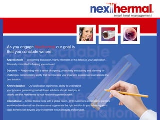 Nexthermal specializes in heat management solutions, emphasizing approachability, dynamism, and extensive application knowledge to support customers globally since its inception in 1986. The company is committed to enhancing R&D capabilities by providing testing, analysis, and innovative designs, while adhering to ISO certification standards for quality and performance. Their advanced products, including the Hotflow modular circulation heater and custom heating solutions, aim to improve efficiency and reduce energy consumption across various industries.