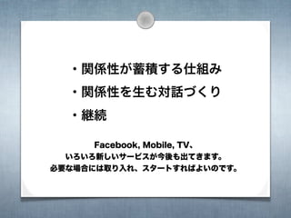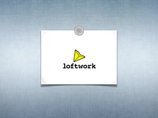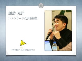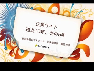 The document outlines the history of loftwork.com, a creative services company started in 1999 that grew to 15,000 creators and 2 million page views per month by 2000. It discusses key events like partnering with Joi Ito in 2002 and a focus on mobile, social, and new technologies. The concluding section thanks the reader and is signed by Mitsuhiro Suwa.