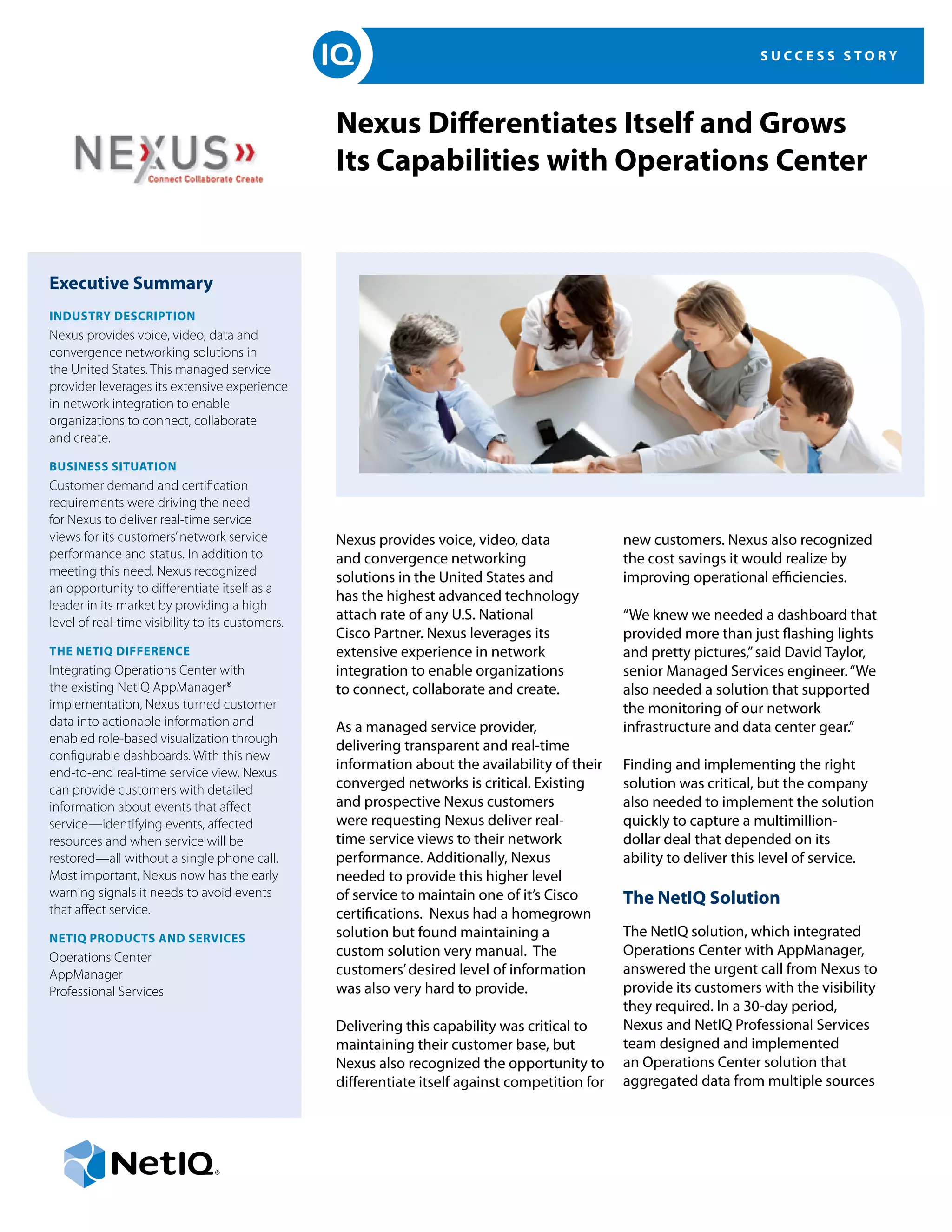 Nexus, a managed service provider in the U.S. offering voice, video, and data networking solutions, improved its service delivery by integrating NetIQ's Operations Center with AppManager. This integration allowed Nexus to provide real-time visibility and actionable insights into network performance, essential for meeting customer demands and enhancing operational efficiency. As a result, Nexus differentiated itself in the market, increased its service capabilities, and improved customer satisfaction by enabling self-service options and early warnings for potential service issues.