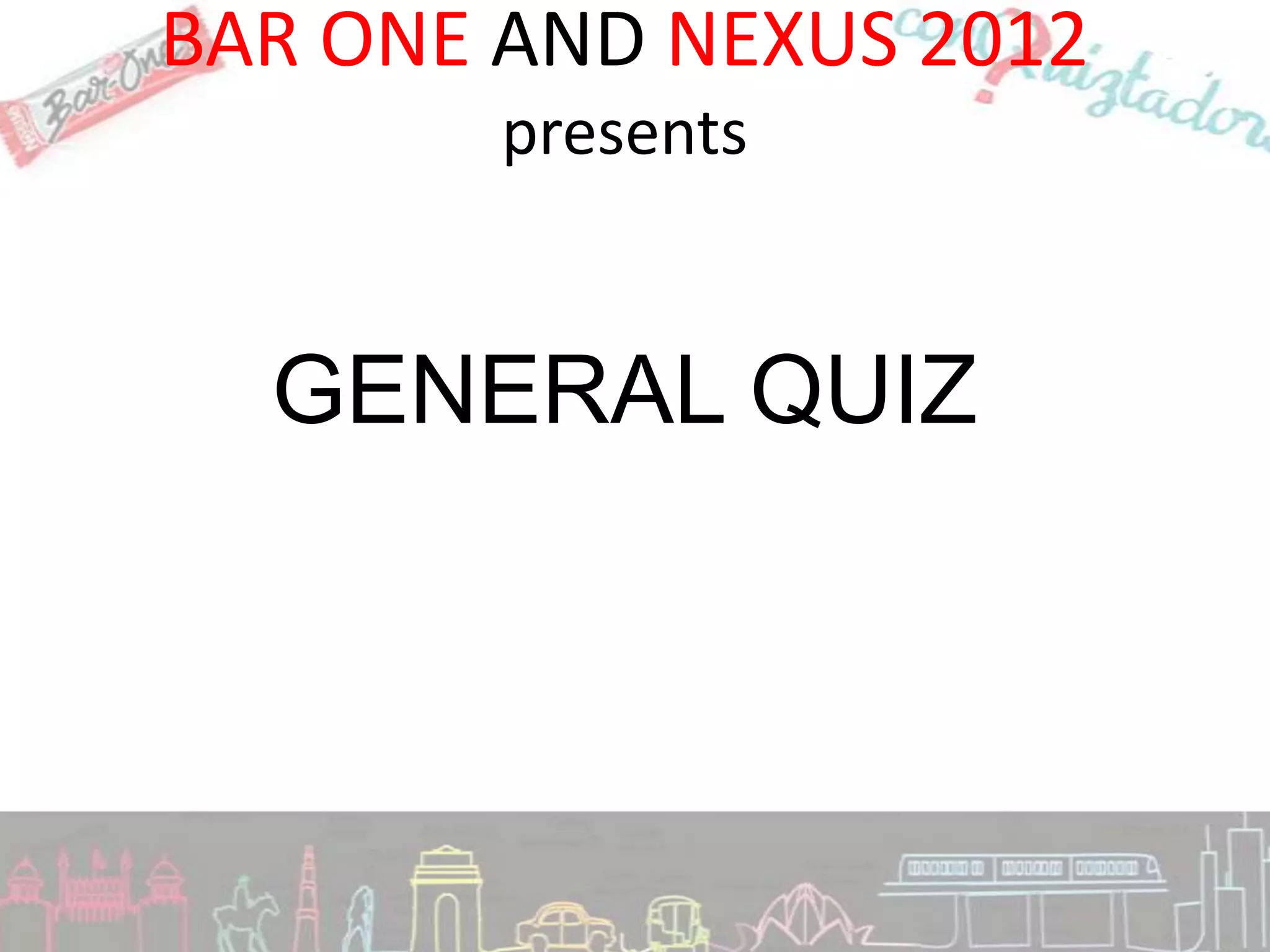 The document provides the rules and questions for a general quiz being held by Bar One and Nexus 2012. It states there will be 25 questions, the top 6 teams will qualify, and in the case of a tie the team with the funniest name will qualify. It then lists 25 multiple choice or fill in the blank questions covering topics like literature, music, history, science and current events. Teams are instructed to not use phones and that the quizmaster's decision is final.