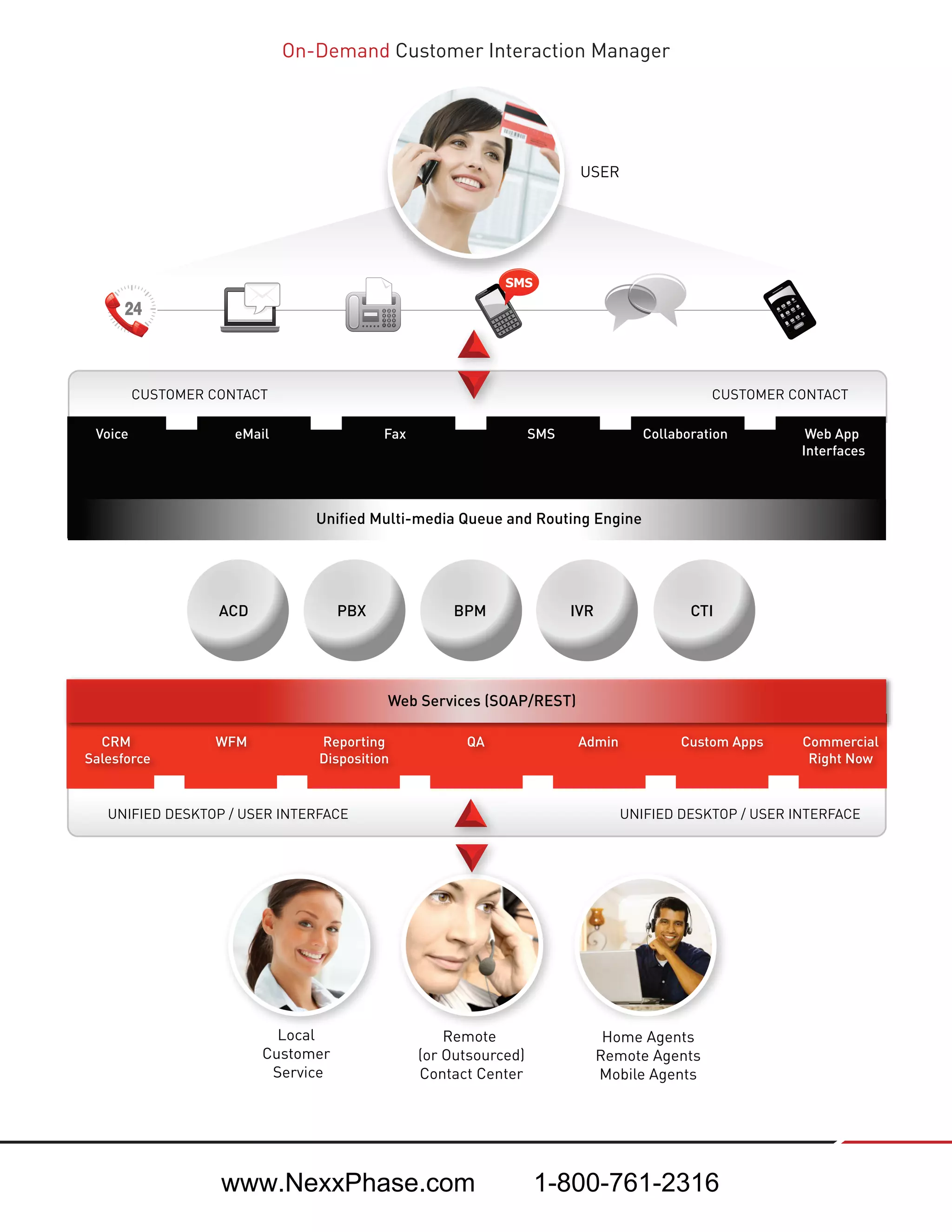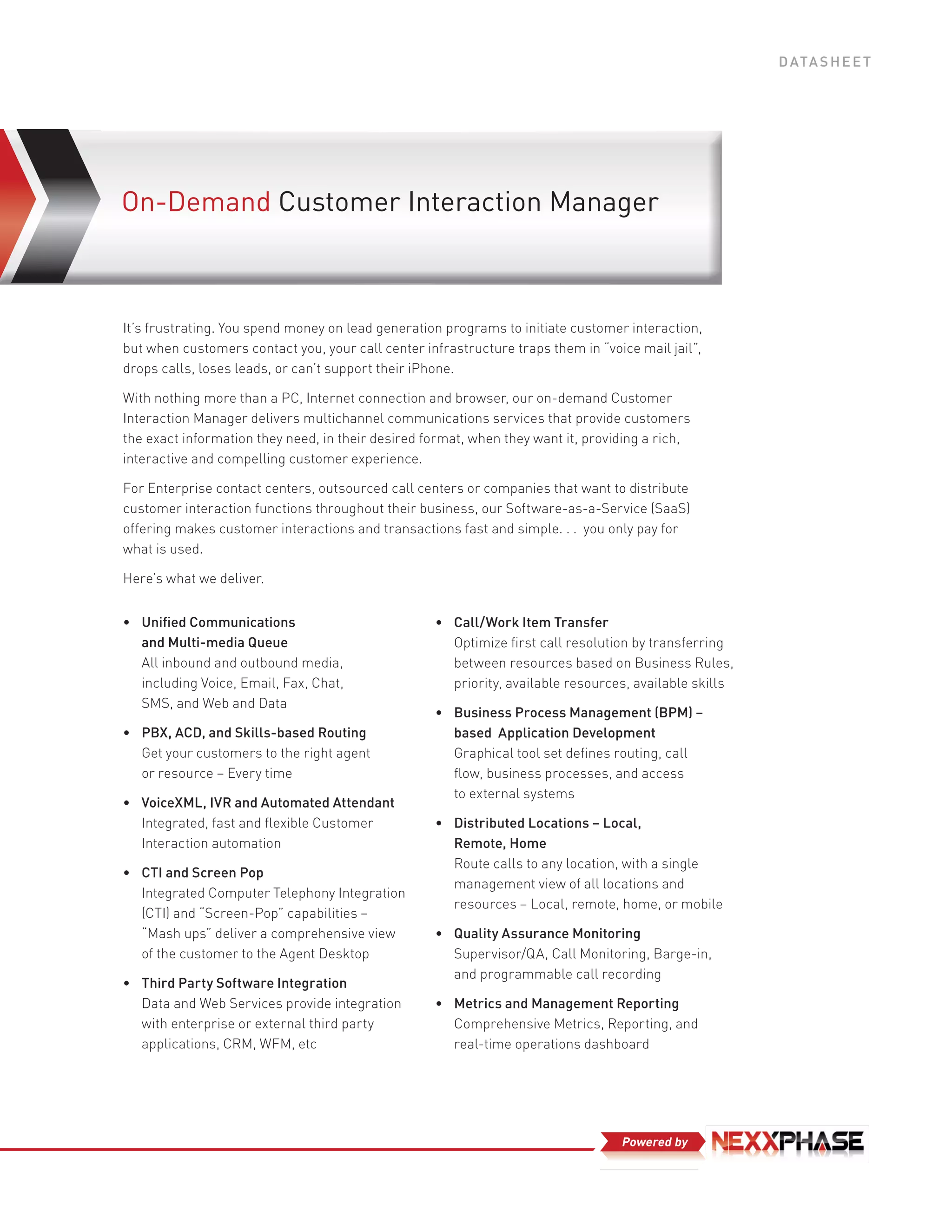 The document describes an on-demand customer interaction manager that provides multichannel communications services through a web browser. It delivers unified communications, skills-based routing, automated attendants, computer telephony integration, and third party integration. The software-as-a-service model allows companies to distribute customer interaction functions throughout their business while only paying for resources used.