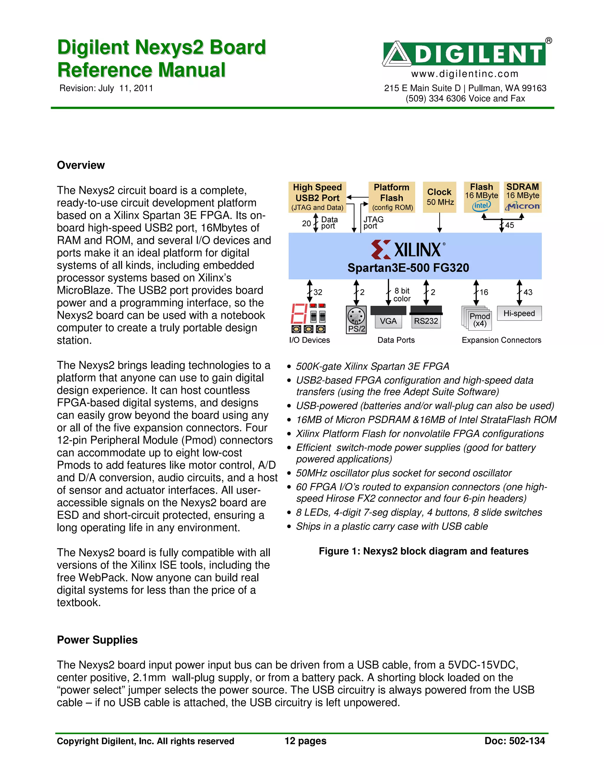 The document provides an overview of the Nexys2 circuit board, which is a complete development platform based on a Xilinx Spartan 3E FPGA. The board includes a USB port for power and programming, 16MB of RAM and ROM, input/output devices, and expansion connectors. It can be programmed via the USB port using free software to load a bitstream into the FPGA or Platform Flash memory. The board also includes power supplies, clocks, and input/output devices to implement digital designs without additional components.