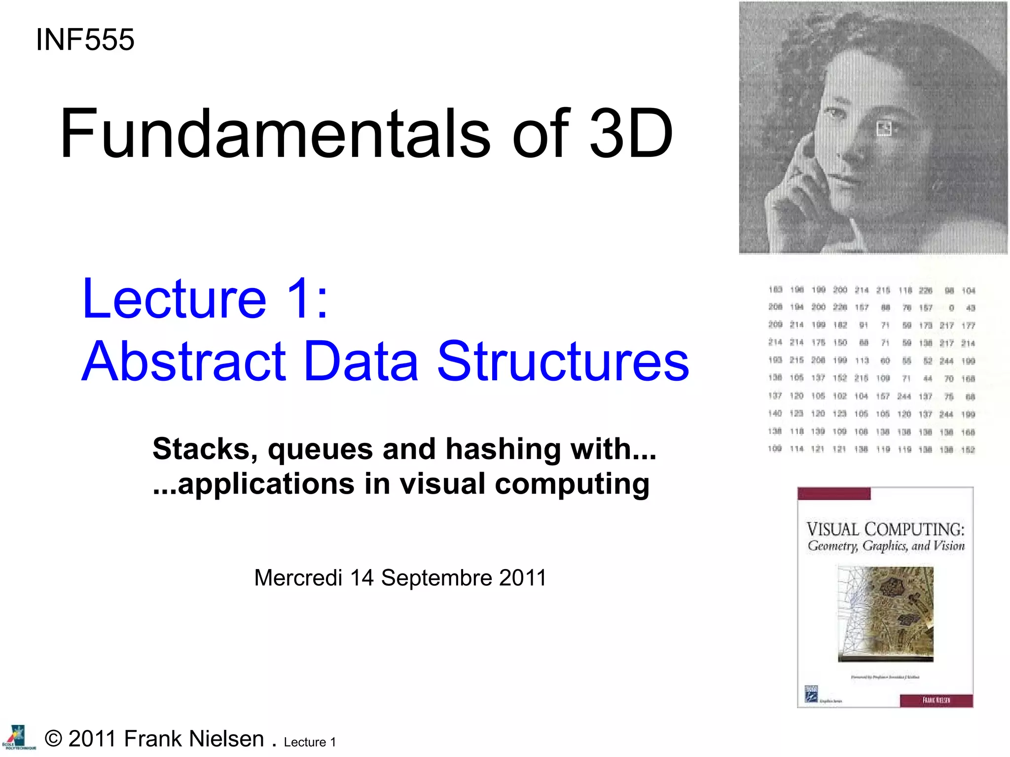 This lecture discusses the fundamentals of 3D visual computing, focusing on abstract data structures such as stacks, queues, and hashing, and their applications in computer graphics. It also includes course logistics, project requirements, and additional reading resources. Topics covered include area flood filling, geometric hashing, and methods for image segmentation and object recognition.