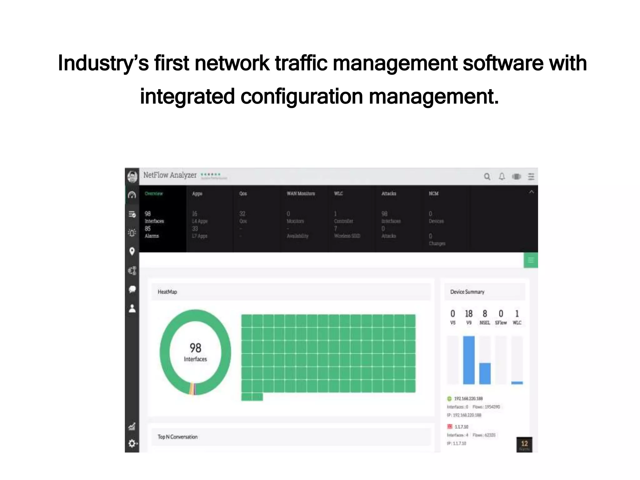 This document describes new features in NetFlow Analyzer v12.2, an integrated network traffic management and configuration management software. The new version includes enhancements to the user interface, integration with wireless LAN controllers, and tighter integration with network management solutions. It also includes new features like one-click flow export, network configuration management, and auto-refresh for traffic graphs.