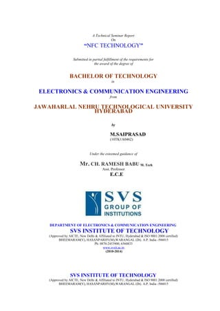 This document is a technical seminar report submitted by M. Saiprasad to fulfill the requirements for a Bachelor of Technology degree in Electronics and Communication Engineering from Jawaharlal Nehru Technological University in Hyderabad, India. The report discusses Near Field Communication (NFC) technology, including its evolution, operating principles, modes of operation, security considerations, and applications. It provides comparisons between NFC and other wireless technologies and analyzes the threats to NFC security as well as standardized protocols to address those threats.