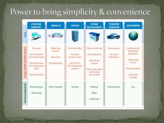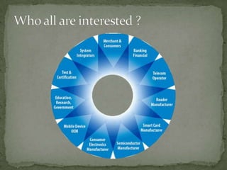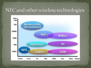 The document discusses Near Field Communication (NFC), a short-range wireless connectivity standard that allows data exchange between devices over short distances. It operates at 13.56 MHz and can transfer data at rates from 106-424 kbps. NFC offers automatic connection establishment, low energy usage, and compatibility with existing RFID infrastructure. However, it does not ensure secure communication or protect against attacks. The document outlines usage models, communication modes, implementation options, applications, Android support details, and key industry developments around NFC adoption.