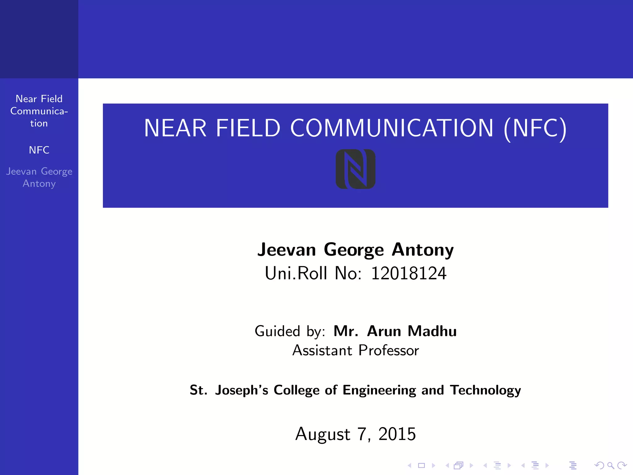 Near field communication (NFC) is a short-range wireless technology that allows data exchange between devices when touched together or brought within close proximity. NFC operates at 13.56 MHz and can communicate at speeds up to 424 kilobits per second within a 10 centimeter range. The document discusses NFC architecture, communication modes, operating modes, threats including eavesdropping and data modification, and defenses such as using encryption to establish a secure channel. It also provides applications of NFC like contactless payments and digital content sharing.