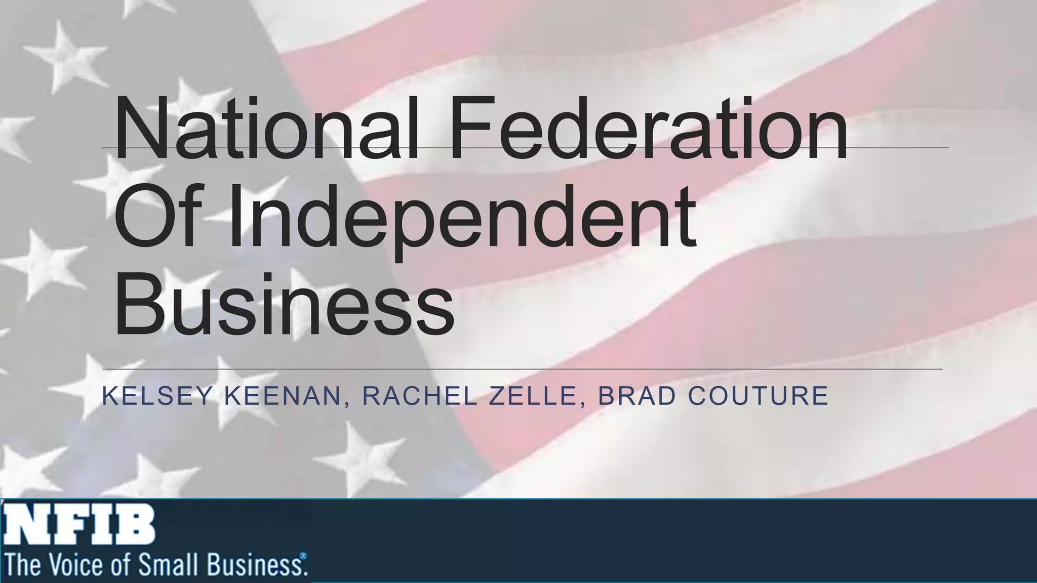 The National Federation of Independent Business (NFIB) is a lobbying group founded in 1943 that advocates for small businesses. It grew from Harder's basement to over 500,000 members by 1977. The NFIB lobbies Congress for policies that reduce regulations and taxes for small businesses. It is led by President Donald Danner and primarily supports Republican candidates through its PAC. The NFIB raises most of its funds from member dues and donations, which it uses for lobbying, litigation, and supporting business-friendly politicians.