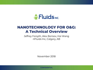 The document provides an overview of Nfluids Inc.'s nanotechnology solutions for oil and gas applications, focusing on drilling fluids and wellbore strengthening. It highlights the benefits of their proprietary nanomaterials, including improved filtration control, lubricity, and reduced oil on cuttings, supported by laboratory and field test results. Nfluids has developed multiple products, including the NFORCE™ additive, which enhances performance and environmental compatibility in drilling operations.
