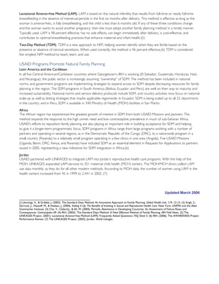 USAID supports expanding contraceptive options for couples in developing countries. In addition to modern methods, USAID has promoted natural family planning methods since 1985 to broaden options and meet the needs of couples preferring natural methods. Three natural methods promoted are the Standard Days Method using CycleBeads, Lactational Amenorrhea Method for breastfeeding women, and the Two-Day Method based on cervical secretions. Studies show these methods can be over 95% effective when used correctly. USAID programs have expanded access to these methods in over 25 countries through public sector programs and partnerships.