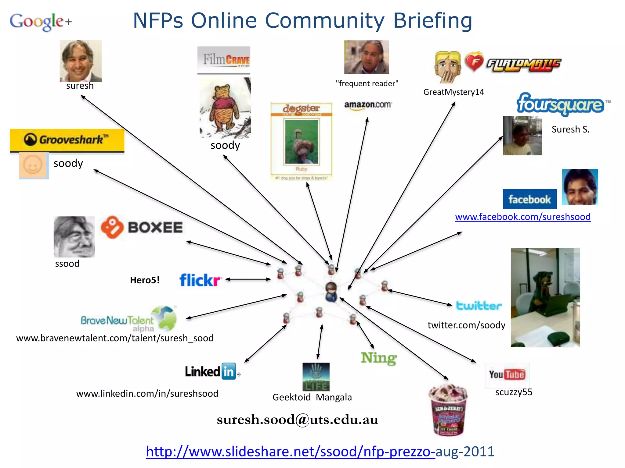 This document summarizes an online briefing about non-profit organizations (NFPs) and social media. It includes an agenda covering topics like human interaction, online social networking, NFP trends, managing online communities, monetizing social media, and applying social media purposefully. There are also brief discussions of wine communities, social gestures on social media, consumer interactions with brands, and key network measures. Case studies are presented on charity responses to disasters in Haiti. Guidelines are provided for launching an online community and participating in online conversations.