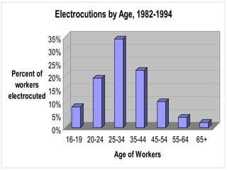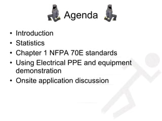 The document discusses electrical safety standards and best practices from NFPA 70E. It covers statistics on electrical injuries and fatalities to emphasize the importance of safety. NFPA 70E requirements are summarized, including establishing electrically safe work conditions, approach boundaries for live parts, protective equipment, hazard analysis, documentation and training. The presentation emphasizes creating an electrically safe work environment by de-energizing whenever possible, and having proper documentation, coordination and PPE for any justified live work.
