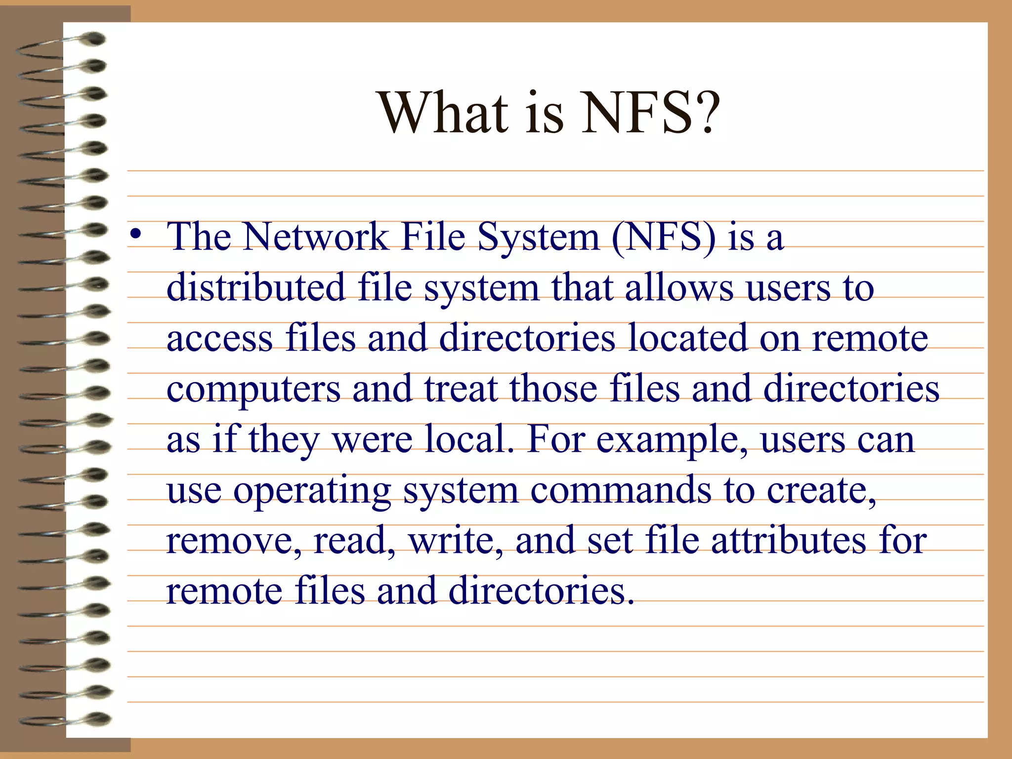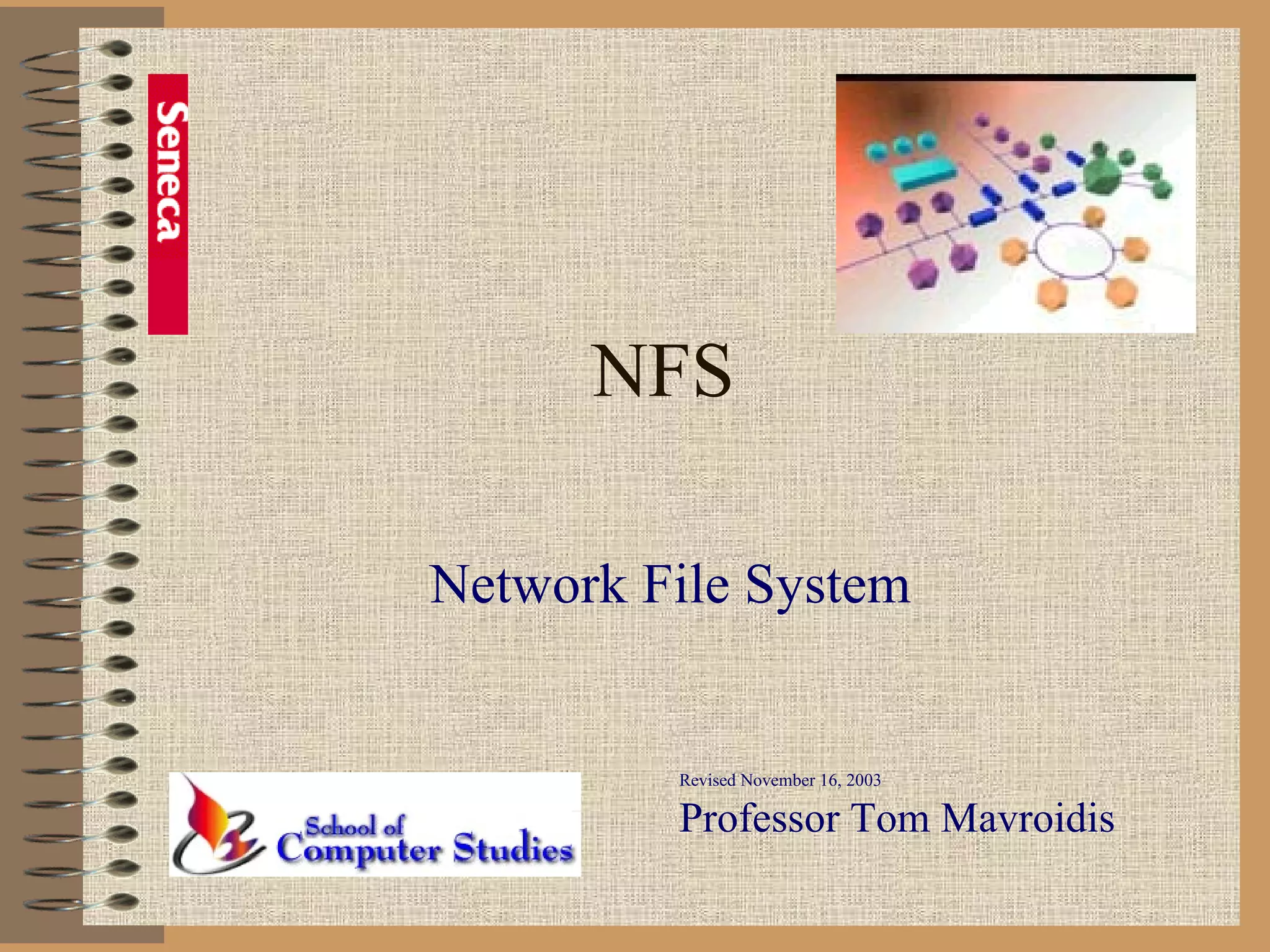 The document discusses the Network File System (NFS) protocol. NFS allows users to access and share files located on remote computers as if they were local. It operates using three main layers - the RPC layer for communication, the XDR layer for machine-independent data representation, and the top layer consisting of the mount and NFS protocols. NFS version 4 added features like strong security, compound operations, and internationalization support.