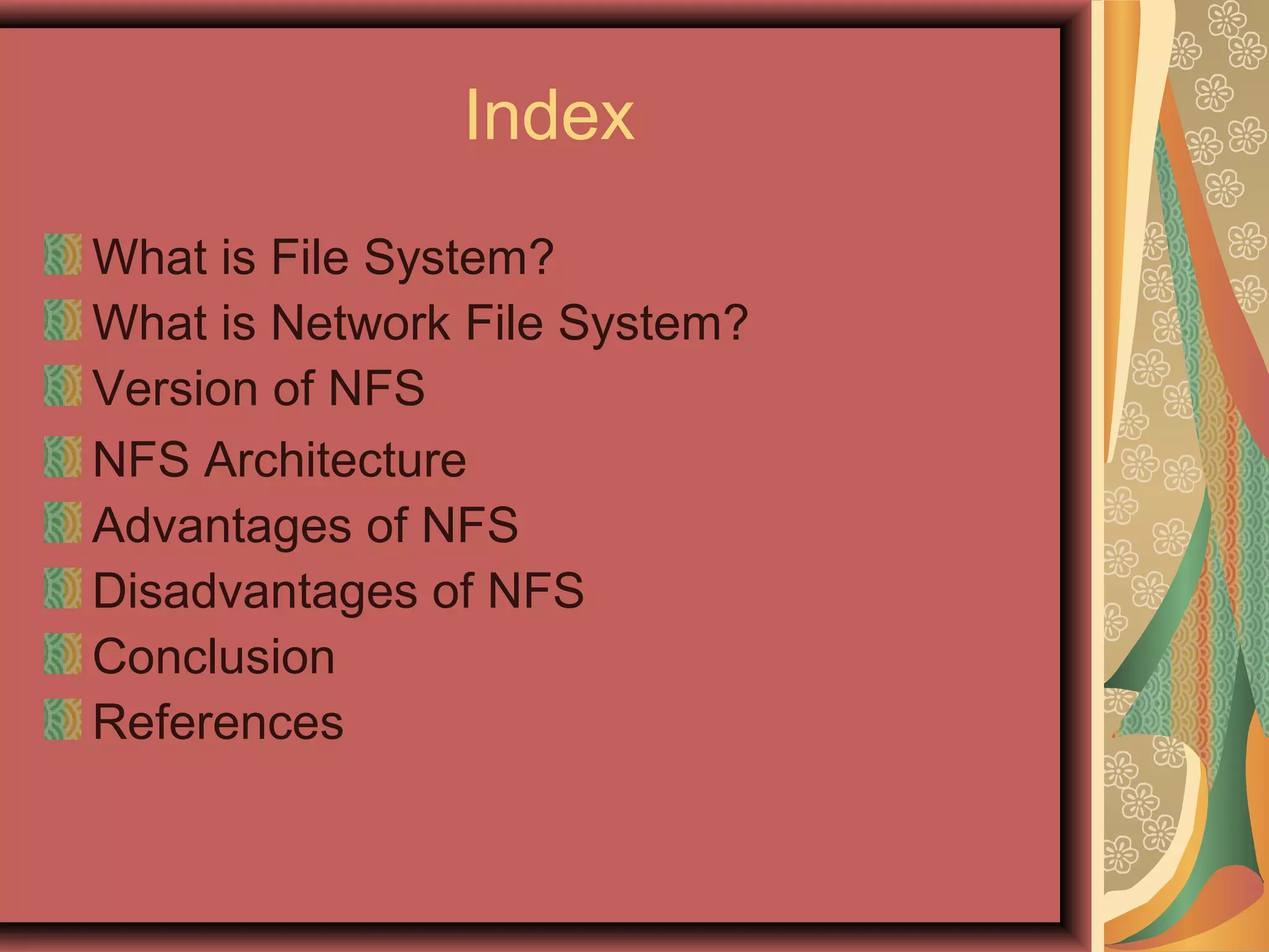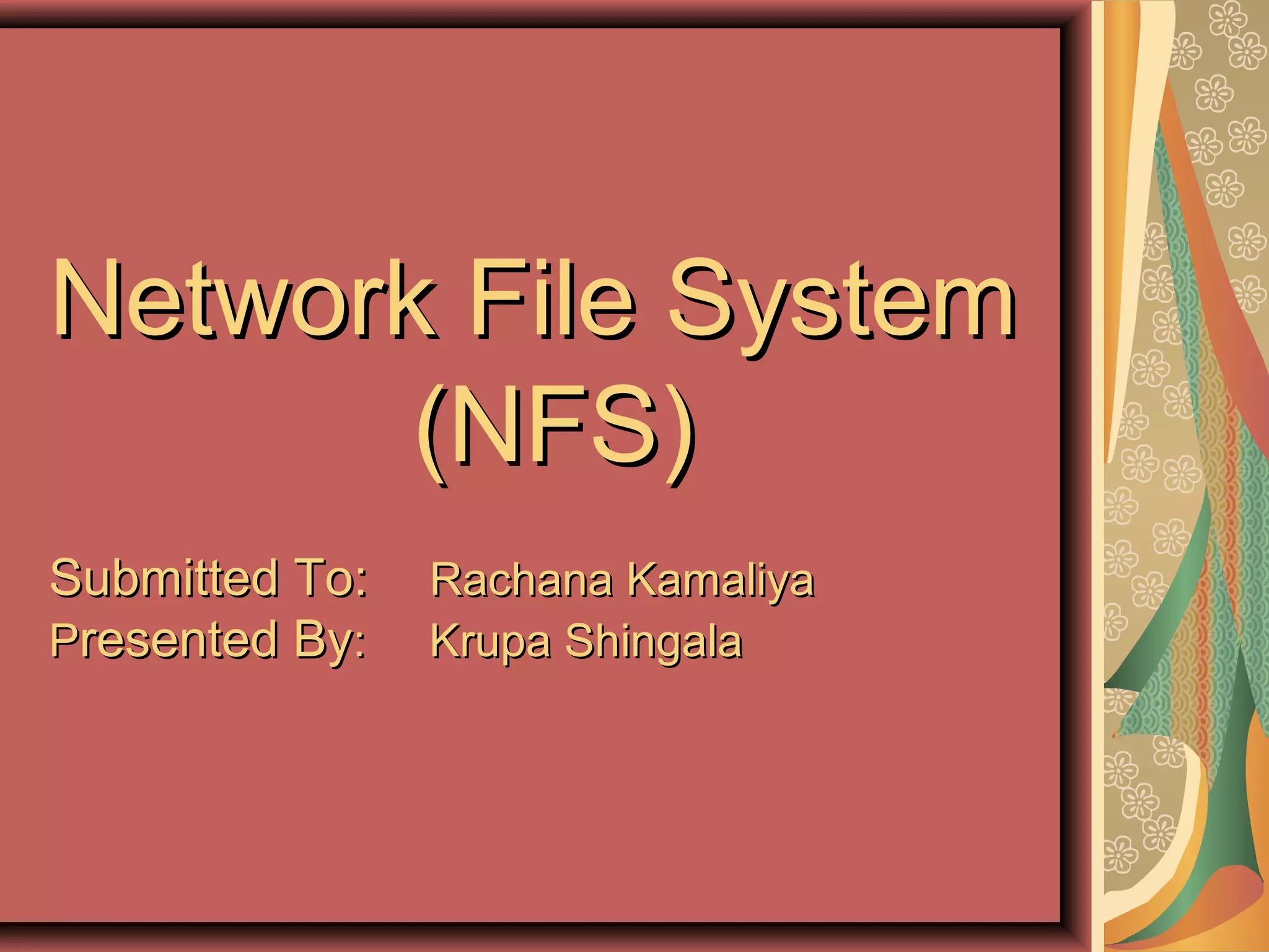 Network File System (NFS) allows users to access and share files located on remote computers. It builds on ONC RPC and has evolved through several versions. NFS uses a client-server model where the client makes RPC requests to access files on the NFS server's file system. This allows for flexible sharing of resources but introduces some security and performance disadvantages compared to a local file system. Overall NFS is a widely used distributed file system protocol.