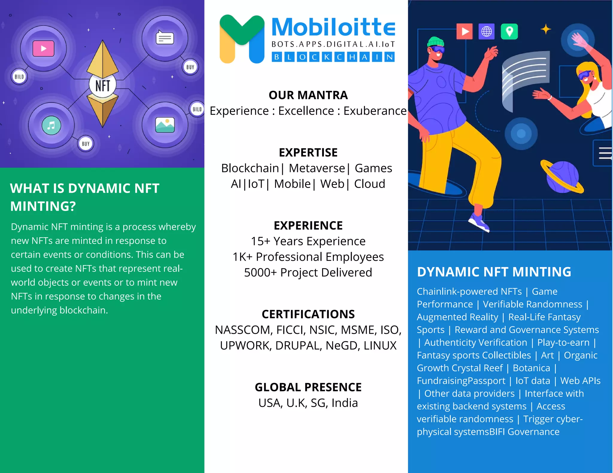 Dynamic NFT minting enables the creation of NFTs in response to specific events or conditions, allowing for unique digital assets tied to real-world objects or blockchain changes. Mobiloitte offers dynamic NFT minting services that utilize cutting-edge technology to create one-of-a-kind collectibles for various applications, including gaming and digital art. Their platform supports easy management and tracking of NFT performance while providing features like Chainlink integration for enhanced functionality.