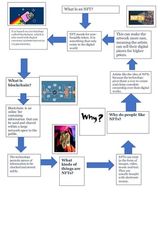NFTs are non-fungible tokens that represent unique digital items like images, video, music and text, stored on a blockchain. Blockchain is a shared online ledger that allows information to be recorded and distributed but not altered. NFTs use blockchain technology to provide artists ownership over their digital works, making the art rare and allowing them to sell pieces at higher prices than otherwise possible.