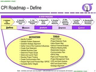 This document provides an overview of process mapping using a SIPOC (Supplier, Input, Process, Output, Customer) chart. It discusses how to create a high-level SIPOC that defines the key steps in a process, identifies important inputs and suppliers, and lists the major outputs and customers. The SIPOC is presented as the first step in process mapping to help visualize the current process and identify areas for potential improvement. Examples of completed SIPOCs are also included to demonstrate how they can be used to identify metrics and scope a process improvement project.