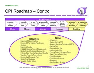 This document provides an overview of process control concepts and tools. It discusses an 8-step process for process improvement that includes control. Control plans are important to ensure improved processes remain stable. Measurement systems should be analyzed and process capability recalculated during control. Cultural issues can impact control and force field analysis can identify drivers and restraints. Standard operating procedures, control charts, and mistake proofing are discussed as control mechanisms.