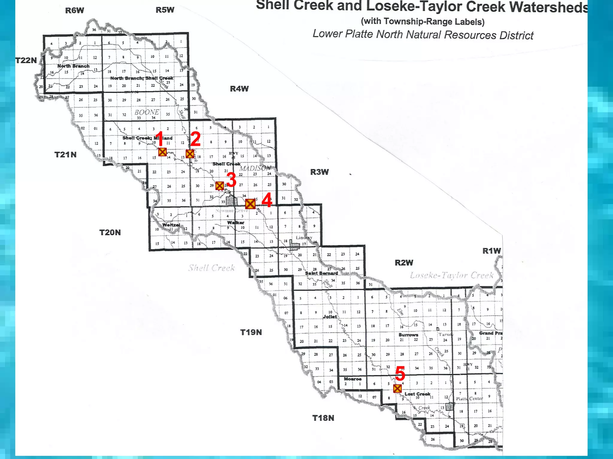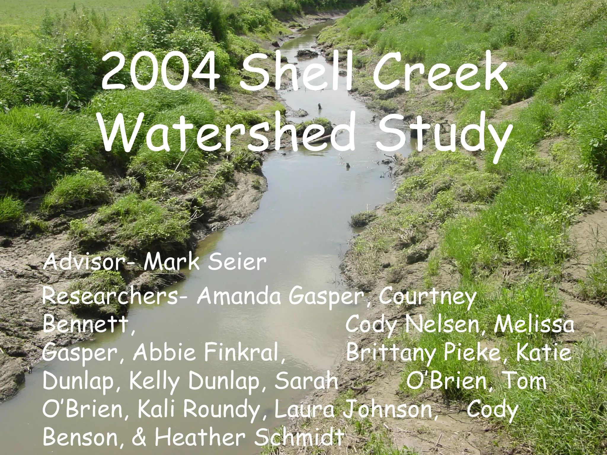 The 2004 Shell Creek Watershed Study was conducted by 16 researchers under the advisement of Mark Seier. Over the course of three sampling periods in May, June, and August, water quality tests were performed at 5 sites on Shell Creek to determine the Water Quality Index. Test results showed medium water quality across most sites and periods, with some sites scoring in the good range on individual tests.