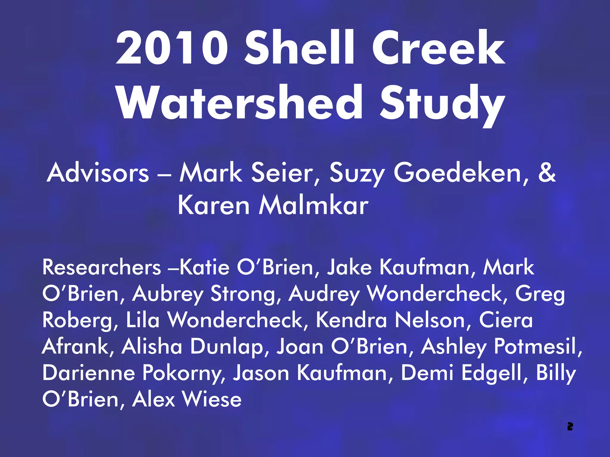 The document summarizes a 2010 study of the Shell Creek and Loseke-Taylor Creek watersheds conducted by researchers from the Lower Platte North Natural Resources District. Water quality was assessed at 6 sites along the creeks through tests of dissolved oxygen, fecal coliform, pH, BOD, temperature, phosphates, nitrates, turbidity, and total solids. Results were used to calculate a Water Quality Index for each site. Overall, water quality was found to be medium to poor, with elevated levels of fecal coliform and total solids observed. Flow rates also varied significantly between sites and sampling dates.