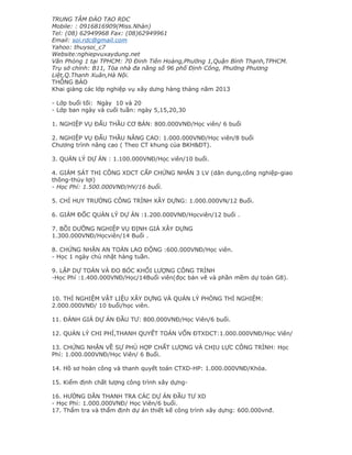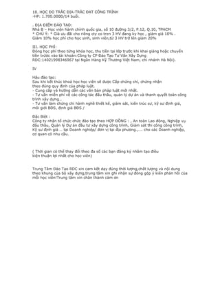 Trung tâm đào tạo RDC Mobile tại TP.HCM và Hà Nội cung cấp các khóa học về nghiệp vụ xây dựng với nhiều mức học phí khác nhau. Các lớp học diễn ra hàng tháng và học viên sẽ được cấp chứng chỉ sau khi hoàn thành khóa học. Ngoài việc đào tạo, trung tâm còn tư vấn miễn phí về đấu thầu và quản lý dự án cho các doanh nghiệp có nhu cầu.