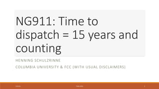 The document discusses the transition from legacy E911 to Next Generation 911 (NG911) in the United States. It notes that the transition has taken over 15 years due to the large number of public safety answering points (PSAPs), varying levels of technical expertise, and lack of consistent national funding. The architecture of NG911 aims to support IP-based emergency calls, real-time text, photos and videos, and more accurate indoor location information. However, challenges remain in fully implementing NG911 across all localities in a reasonable timeframe.