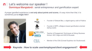 1) Dominique Mangiatordi gave a keynote on how to scale user, employee, and client engagement using gamification techniques.