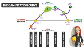 2) Gamification uses gaming techniques to create engagement and motivate actions by appealing to intrinsic motivations like autonomy, mastery, and purpose, as well as extrinsic motivations like rewards and feedback.